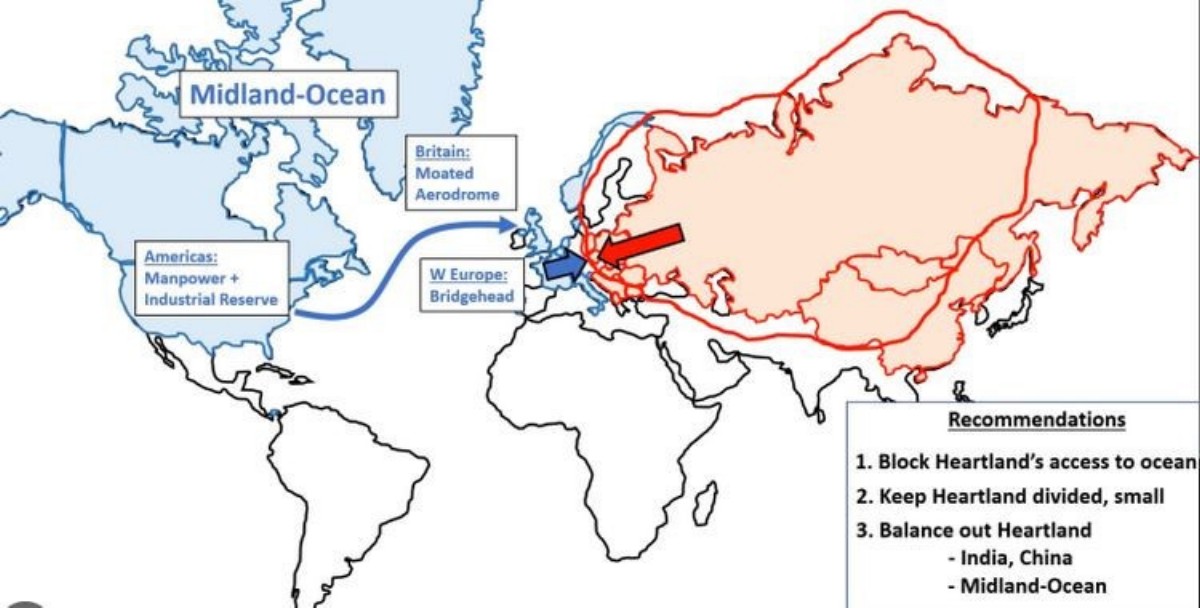 Poi il “cuore” divenne l’Asia, cioè la Russia e la Cina. La rivoluzione industriale stava cambiando tutto. Come disse Mackinder, il controllo di questo “Heartland” avrebbe permesso di controllare “l’Isola Mondo” – tutta l’Asia, insieme all’Africa e almeno il 50%-70% delle risorse mondiali.